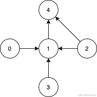 注意到节点 0,3 和 2 无法从其他节点到达,所以我们必须将它们包含在结果点集中,这些点都能到达节点 1 和 4 。