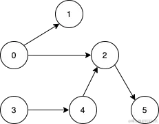 从单个节点出发无法到达所有节点。从 0 出发我们可以到达 [0,1,2,5] 。从 3 出发我们可以到达 [3,4,2,5] 。所以我们输出 [0,3] 。