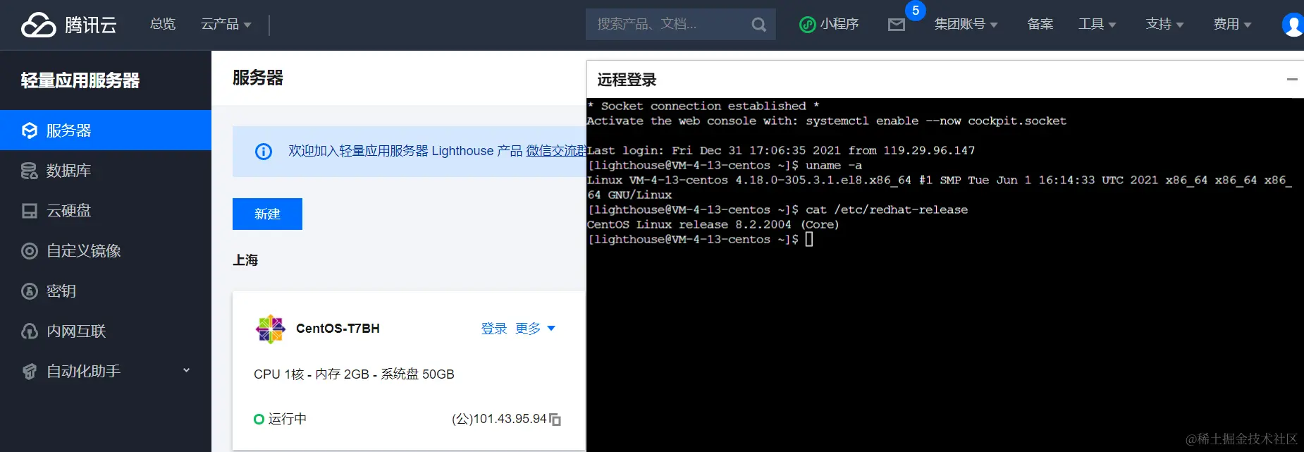 目前个人所用是腾讯云轻量级应用服务器,镜像选择为centos8(单纯是因为公司服务器也是centos8),购买完成后稍等片刻就可以登录,为了本地ssh登录方便,可在更多里面管理开启ssh远程登录,登录的地址为公网ip