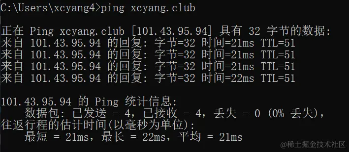 此时在本地通过cmd 去ping我们的域名,是可以正常解析的。