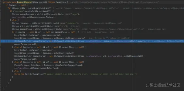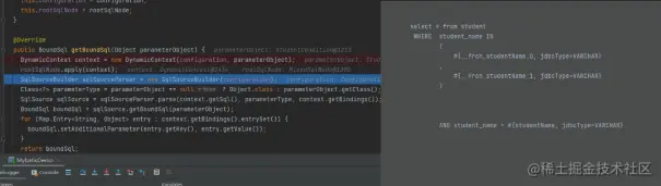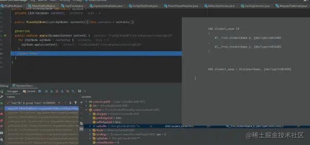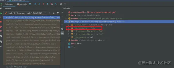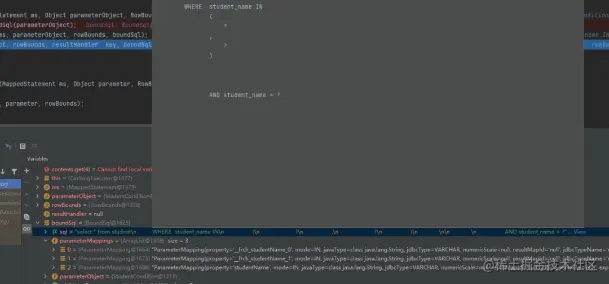 通过运行结果可以看到,没有给 student_name 单独赋值,但是经过 MyBatis 解析以后,单独给 student_name 赋值了一个值,可以推断出 MyBatis 在解析 SQL 并对变量赋值的时候是有问题的,初步猜测是 foreach 循环中的变量的值带到了 foreach 外边,导致 SQL 解析出现异常,下面通过源码进行分析验证