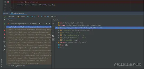 进行绑定参数的时候,绑定完成 foreach 的方法的时候,可以看到 bindings 中不止绑定了 foreach 中的两个参数还额外有一个参数名字 studentName->lct2, 也就是说最后一个参数也是会出现在 bindings 这个参数中的,