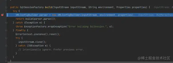 代码中首先通过调用 SqlSessionFactoryBuilder 中的 build 方法来获取对象,进入 build 方法