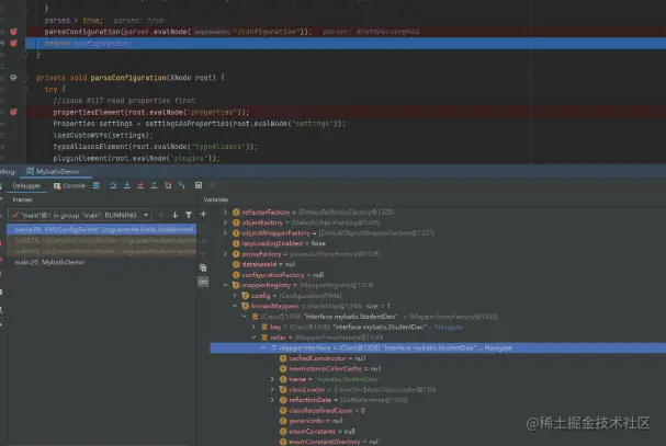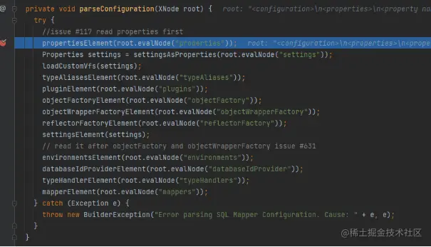 在这个方法中,会从 MyBatis 的配置文件的根目录中获取 xml 的内容,其中 parser 这个对象是一个 XPathParser 的对象,这个是专门用来解析 xml 文件的,具体怎么从 xml 文件中获取到各个节点这里不再进行讲解。这里可以看到解析配置文件是从 configuration 这个节点开始的,在 MyBatis 的配置文件中这个节点也是根节点