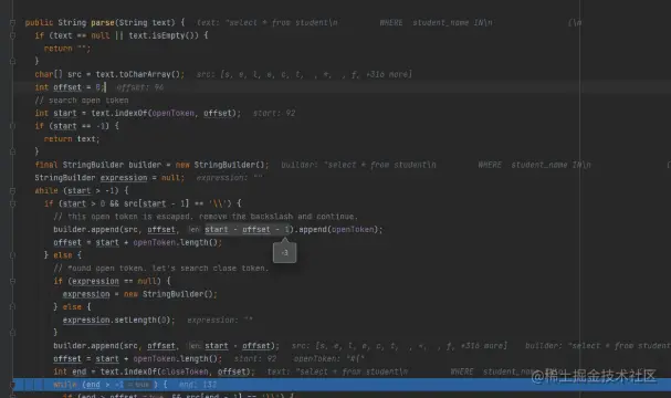 org.apache.ibatis.parsing.GenericTokenParser#parse 对解析出来的 SQL 进行解析