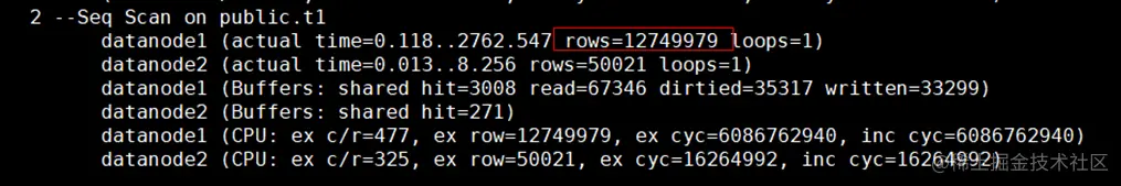 在查询计划的DN信息中,通过rows可以看出在datanode1上扫描的数据量明显多于datanode2,说明有存储倾斜,这种情况建议对表进行合理的设计,选择合适的分布列,将数据均匀分布到所有的DN上。