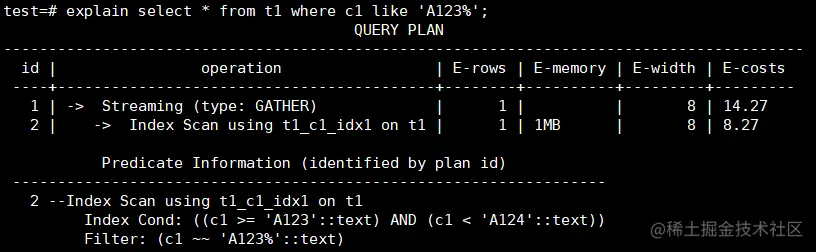 例如c1列的类型为text,创建索引时增加text_pattern_ops。