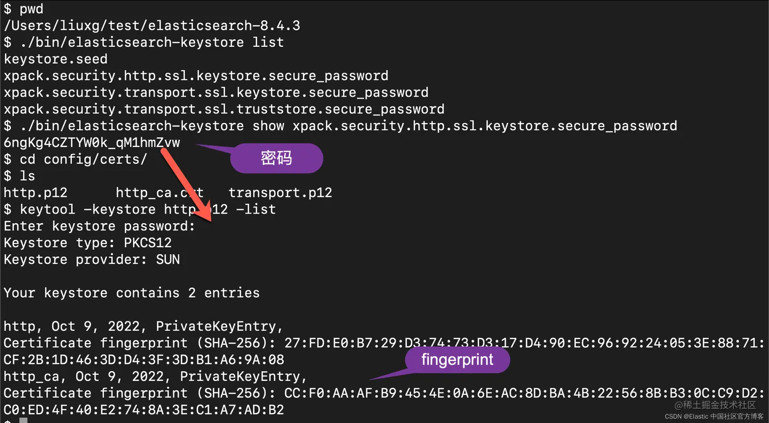 如上所示,我们可以发现 CA 证书的 fingerprint。事实上,我们也可以直接从 http_ca.crt 文件了提前到这个 fingerprint: