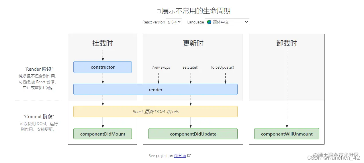 getSnapshotBeforeUpdate() : 在最近一次渲染输出(提交到 DOM 节点)之前调用。