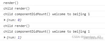 点击按钮,父组件状态num被改变,引起父组件重新渲染render()->子组件也会更新child render()->child componentDidMount() ,{num: 0},条件成立 执行setState()->child render()->child componentDidMount() {num: 1} 条件不成立 不会执行setState