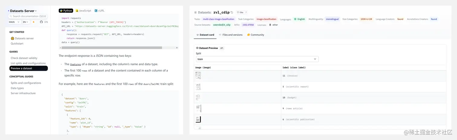 Datasets server 是一个轻量级的网络 API,用于可视化和探索所有类型的数据集--计算机视觉、语音、文本和表格--存储在Hugging Face Hub上。随着数据集规模的扩大和数据类型的丰富,预处理(存储和计算)这些数据集的成本可能具有挑战性和耗费时间。为了帮助用户访问这些现代数据集,Datasets Server在后台运行一个服务器,提前生成API响应,并将其存储在数据库中,这样当你通过API进行查询时,它们就会立即返回。