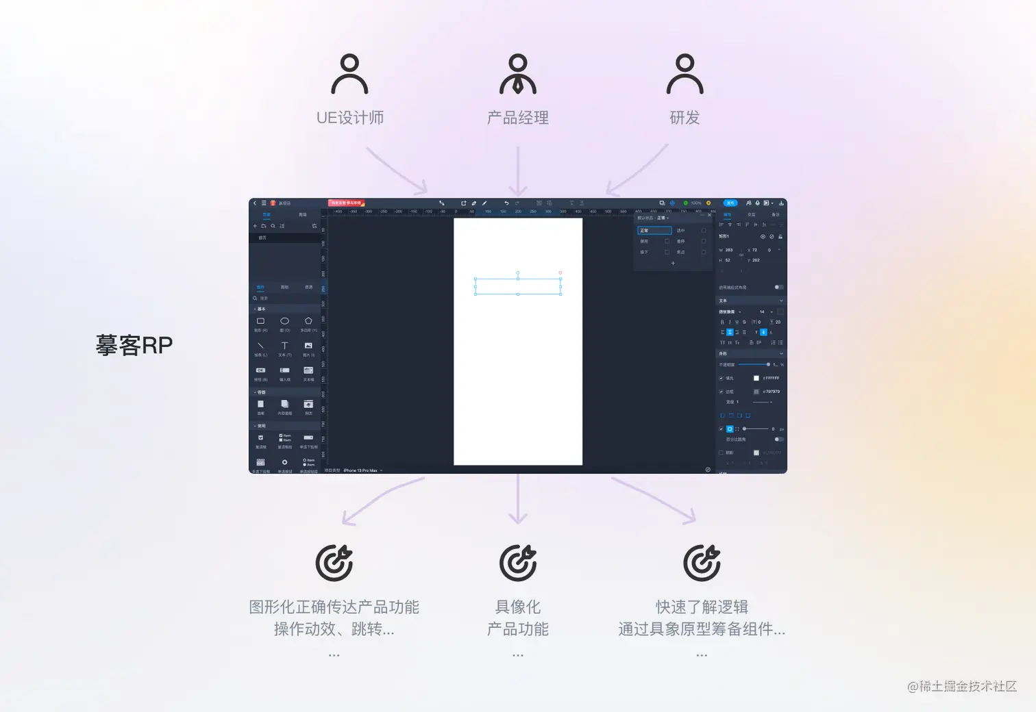 把工具产品比喻成一个小中台来说,所有用户都是中台的需求方,不同需求方的目的不同,但是作为小中台来说都是需要同时满足的。以摹客RP来举例,作为一款协作产品,用户群可大致分为产品经理、UE设计师、研发等,而针对不同的用户群目标来看,产品经理的核心目标是快速通过原型具像化产品功能,而UE设计师则是通过产品经理的思想以图形化的形式表达出来,而身为研发的核心目标是快速了解业务逻辑,以便构思开发结构。