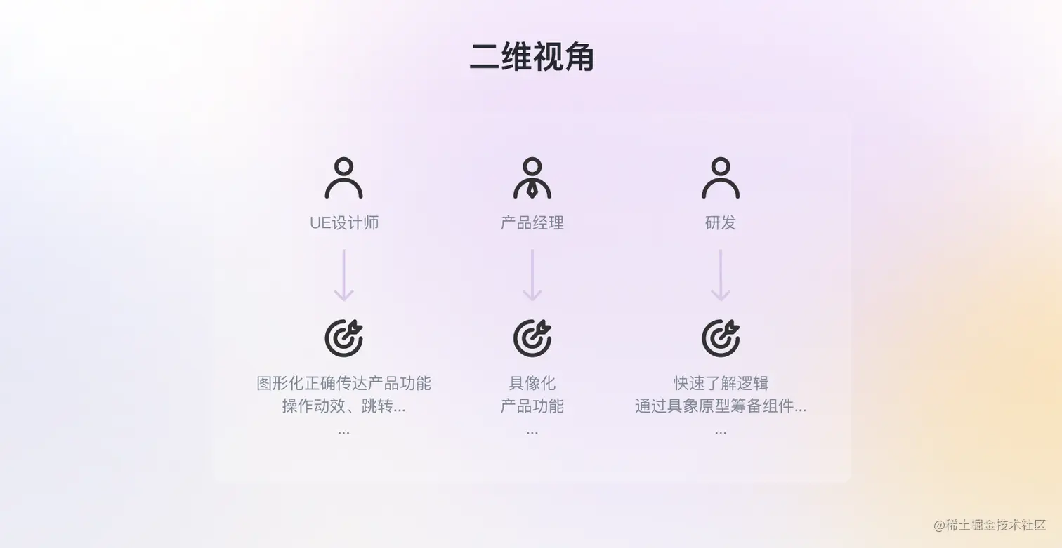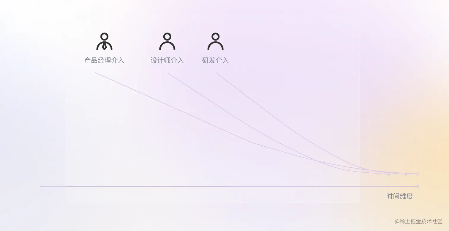 无论是思路1还是思路2,不难发现:将原型工具的核心目标降本和增效,往上抽象出一层就是围绕两个维度在解决问题:一个是具备时效性的时间维度,一个是具备多元性的角色维度。从上图可以感知到:不同时间节点,不同角色介入的时间随着时间维度的增加而变化。