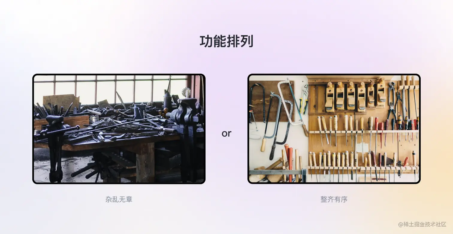 毋庸置疑大家肯定都会选择右边那个工具间,因为功能排列整齐有序,不管你维修工是水电维修还是建筑维修还是网络维修,都能在这个工具间找你能帮你完成你的目标。这便是所谓的擅百技——基于用户群的需求全部将功能一一实现。