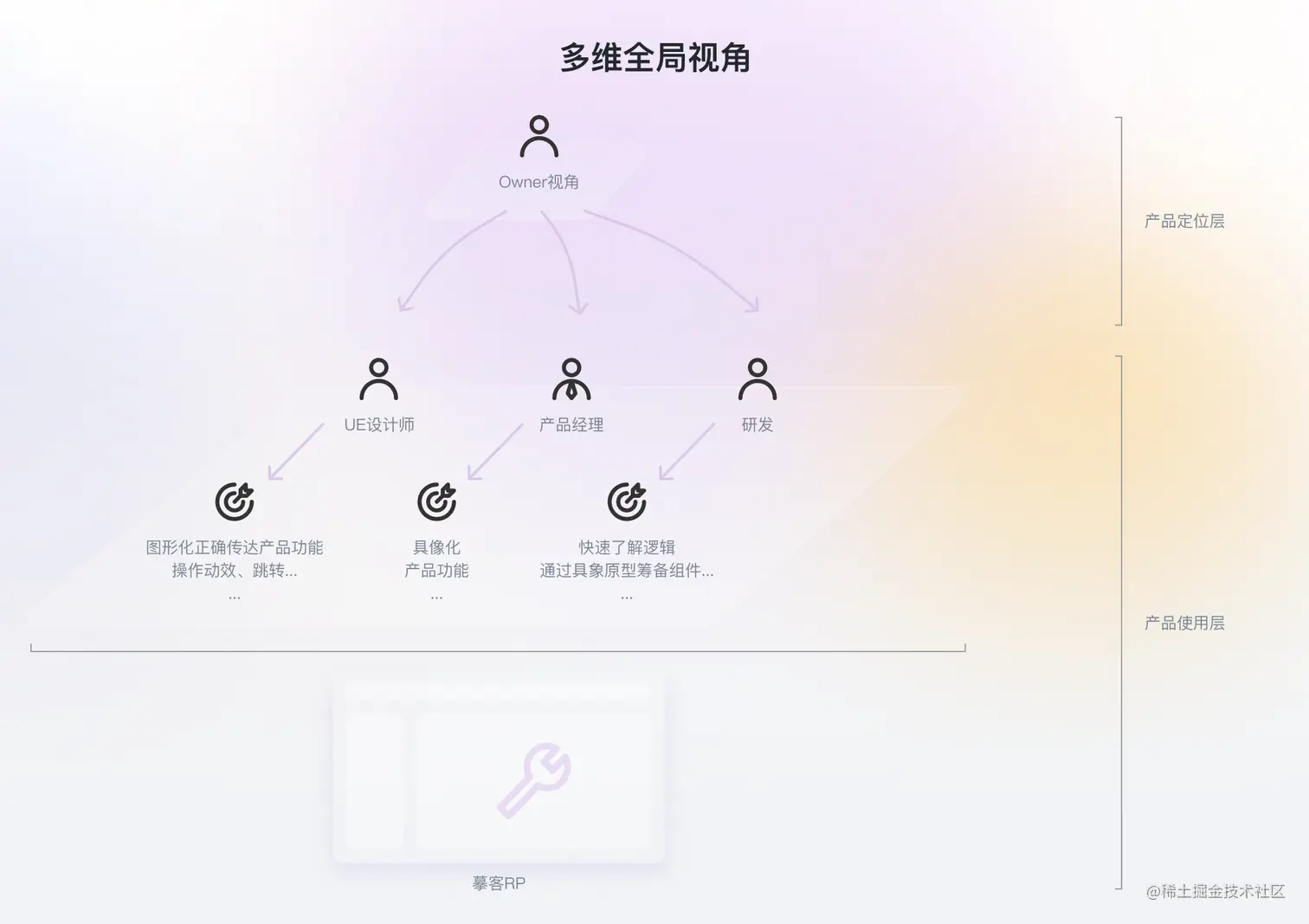 从二维视角下来看,各个角色以目标核心出发各司其职,通过工具平台功能都能很好实现目标;但是我们不妨拔高一层视角来看看: