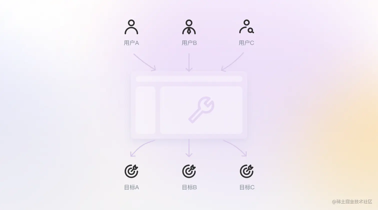 从上图可以看出,无论是降人力成本、认知成本等等,还是增加学习效率、体验效率等等,所有对象都指向了用户群体。有人就会问了:你这不是废话嘛,工具不就是给用户用的嘛?诶~还真不一样!用户群虽然特指一个群体,但是隶属不同目标下,自然而然也有类别区分。