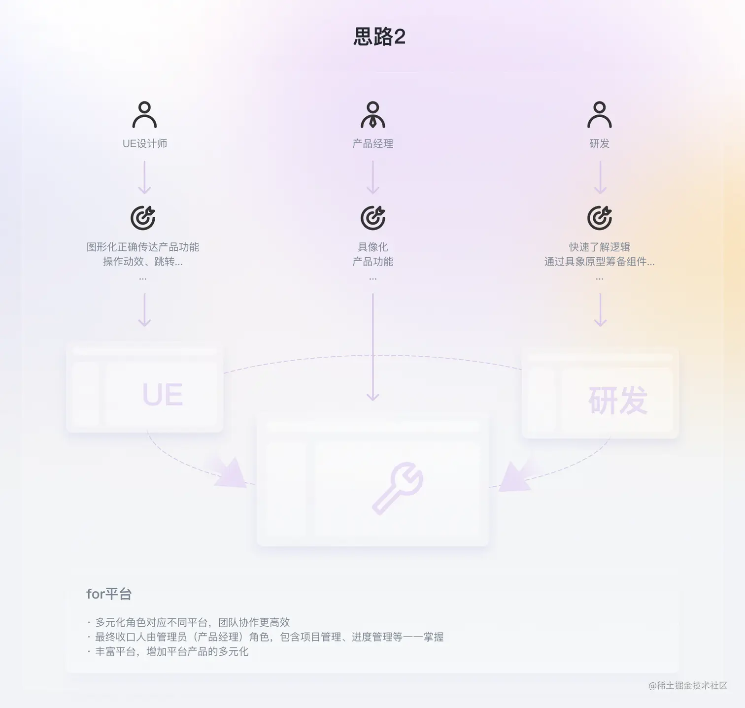 思路2则是基于前面个性化定制工具平台的思路上进行优化改造的,通过不同角色视角进入不同的工具平台,通过数据打通串联实现多角色同平台操作,减少时间维度上的强依赖关系。