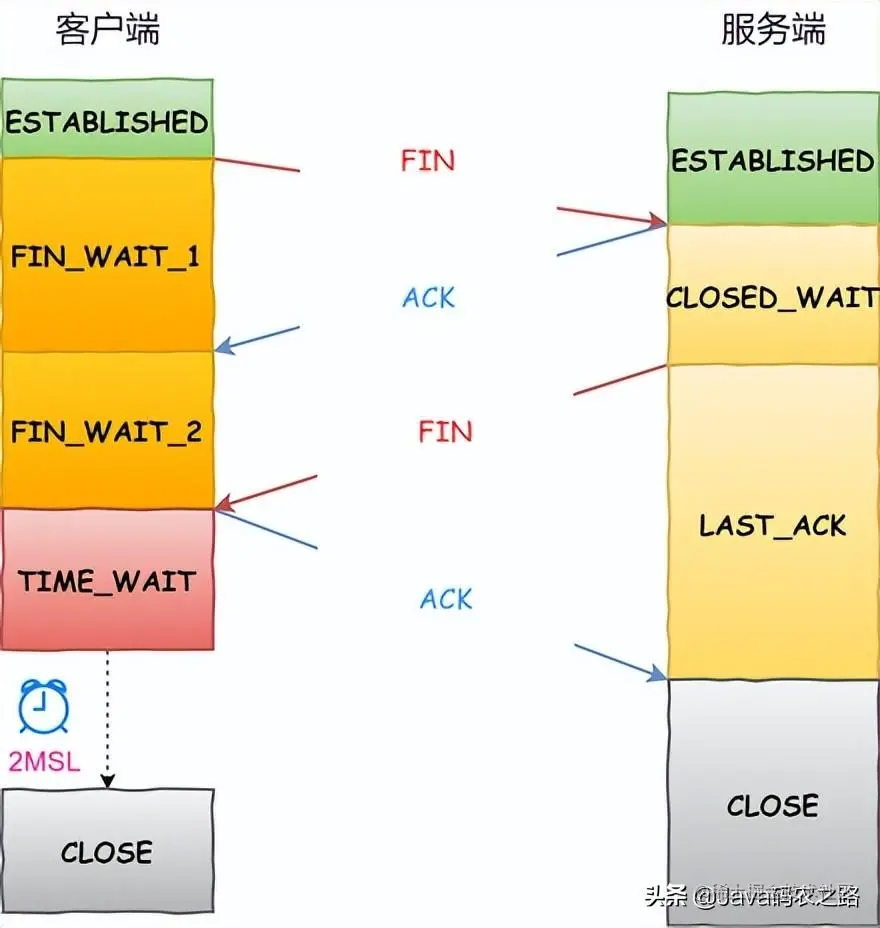 客户端在经过 2MSL 时间后,自动进入 close 状态,至此客户端也完成了连接的关闭。