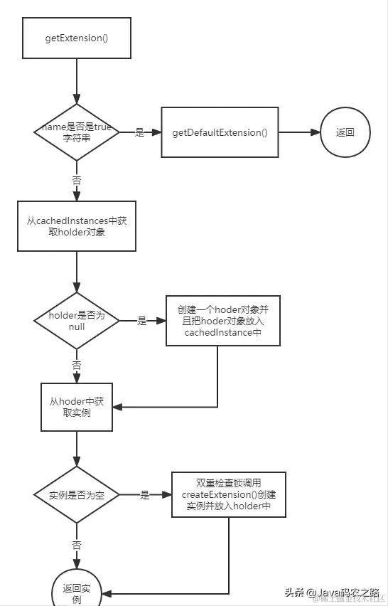 如果name是字符串true,那么会调用getDefaultExtension()方法获取默认的扩展点实例。否则会先从缓存holder中获取对应名称的扩展点实例,获取不到的话调用createExtension()方法创建扩展点实例并且放入到holder对象中缓存起来。这里我们重点对getDefaultExtension(),createExtension()两个方法进行分析。
