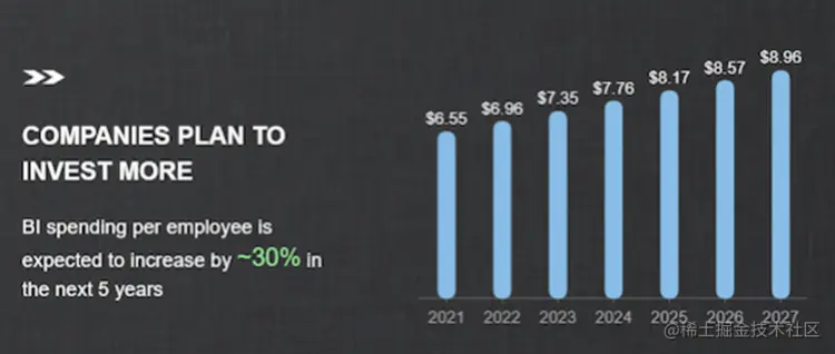 虽然统计数据显示公司计划雇用 IT 员工来管理 BI,但自助式 BI 解决方案对用户非常友好。授权员工使用 BI 可以带来更快的洞察力、增强的团队协作、员工的整体满意度等。 即将到来的趋势确实表明,未来几年每位员工的 BI 支出预计将增加 30%: