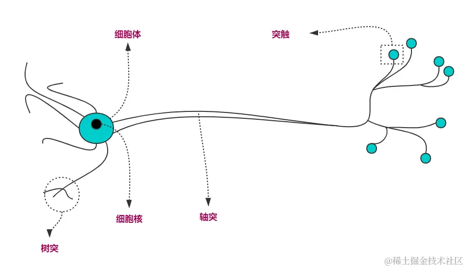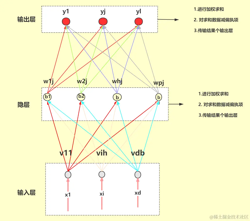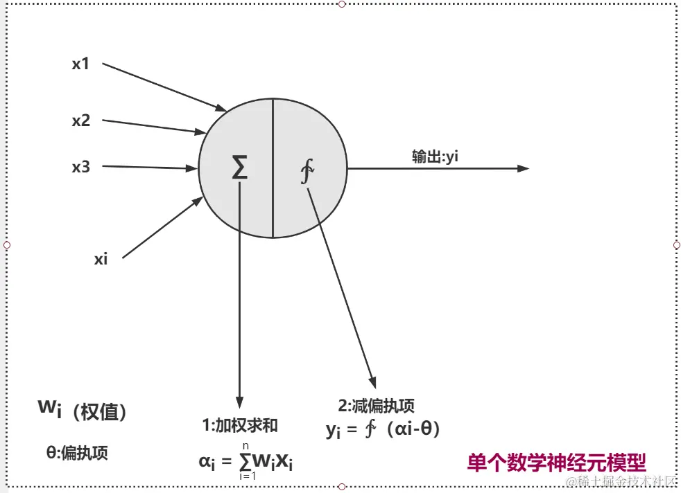 一.认识神经网络 唐某人_import 2022-10-12 104 阅读1分钟 一.认识神经网络 1.神经元认知 (1)神经元传输步骤 步骤1: 树突接触刺激,产生电流 步骤2: 判断并传输电流(判断条件: 电流强度) 若电流强度达到阈值,则传输。 若电流强度未达到阈值,不传输 (2)神经元传输过程 2.转换数学模型 步骤1: 传入数据 (x1,x2,x3.....xi) 步骤2: 对传入数据进行加权求和 步骤3: 对求和数据减偏执项 步骤4: 输出或传输给其他神经元,yi 二.神经网络结构 0