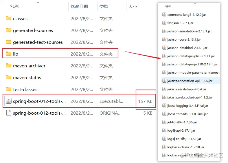 发现target目录中多了个lib文件夹,里面保存了所有的依赖jar,自己业务相关的jar也只有小小的157kb,相比之前21M,足足小了100多倍;