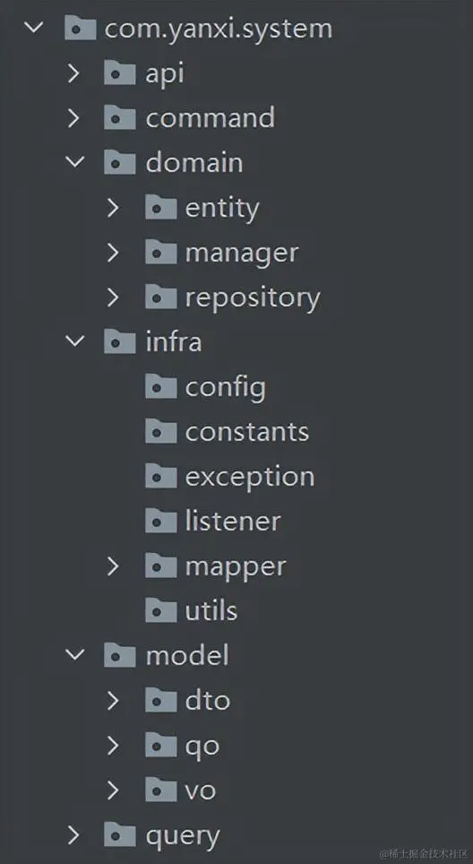 - 应用层:这里使用了命令模式,并且读写分离成了两个包(command、query),如果不使用命令模式可以合并成一个service包