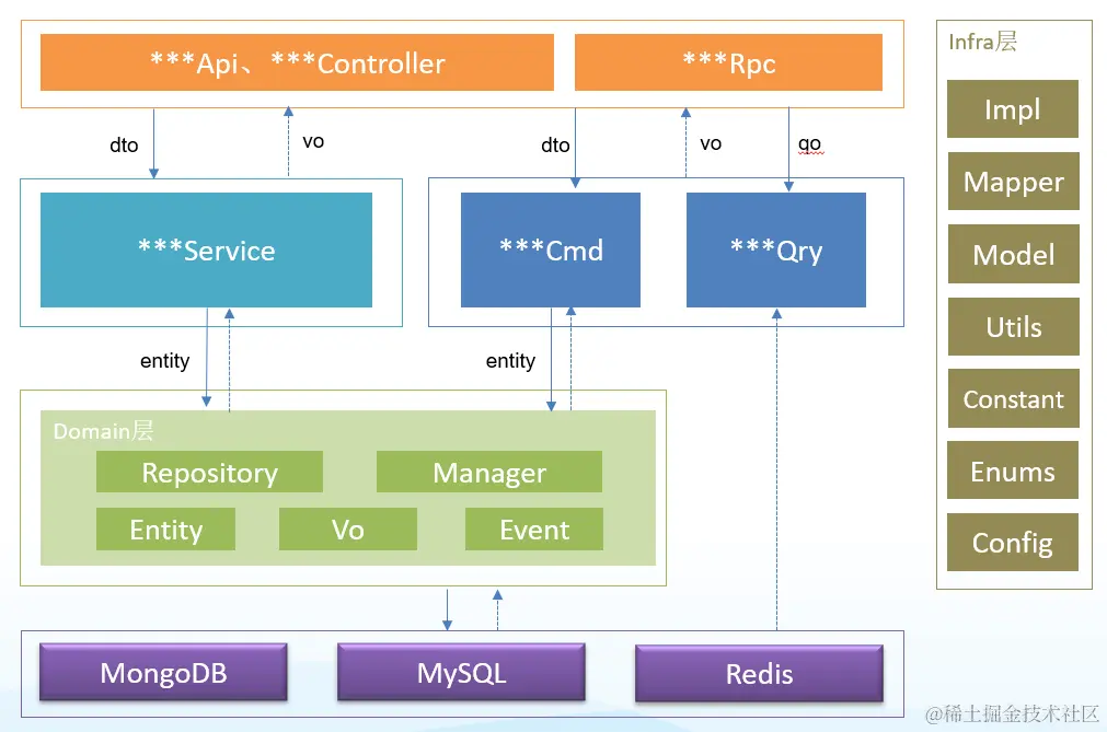 - 基础设施层:infra包,其他所有的公用组件都放在这里,如果使用DIP依赖倒置,那么实现类也放在这里。