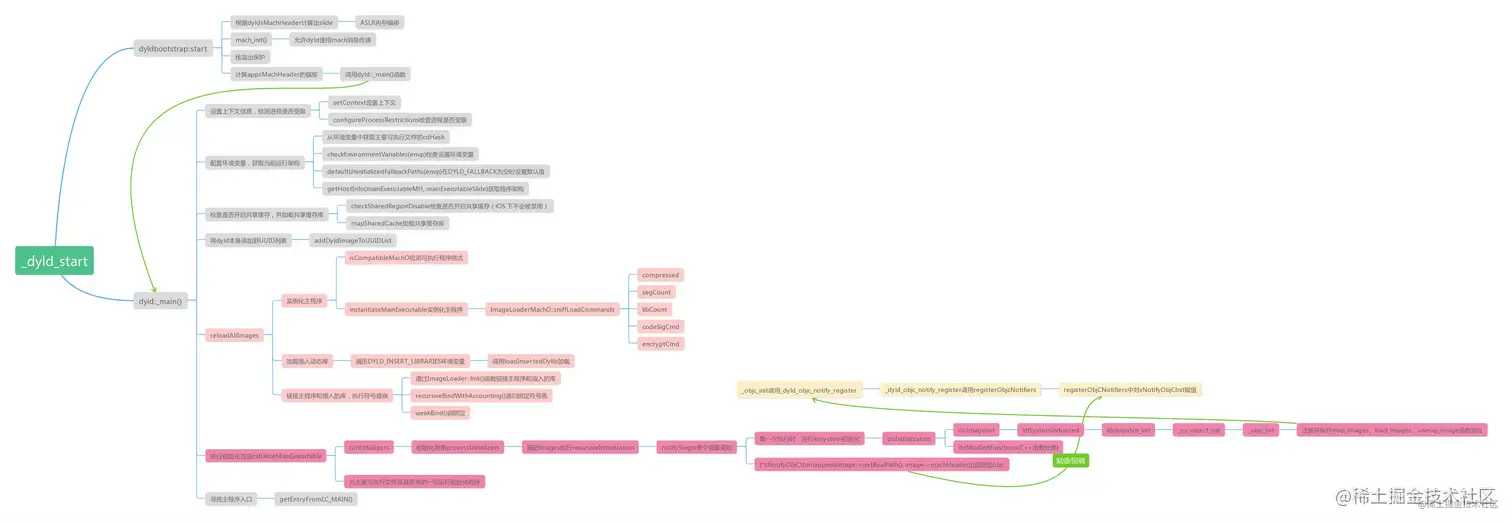 libsystem初始化——doInitialization->doImageInit->libSystemInitialized libsystem的初始化,会调用起libdispatch_init,libdispatch初始化会调用_os_object_init, 内部调用了_objc_init_objc_init中注册并保存了map_images、load_images、unmap_image函数地址- 注册完毕继续回到