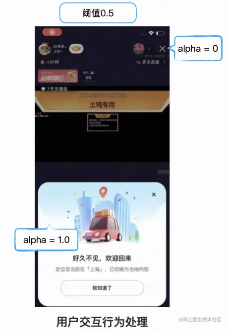 弹窗大小和位置多样,为了支持所有弹窗类型展示,容器默认用全屏的view展示。全屏的view会挡住宿主页面,拦截宿主页面的用户交互事件,而在挂件、底部提示条场景下,用户需要和页面交互,所以有一套机制来处理用户交互事件,可以根据当前点击区域的不透明度判断。默认不捕获任何交互行为。