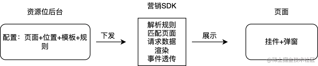 资源位后台作为配置物料入口,指定页面,配置规则,圈定人群;营销SDK作为端侧引擎,精准匹配页面,解析规则,二次校验,渲染展示;