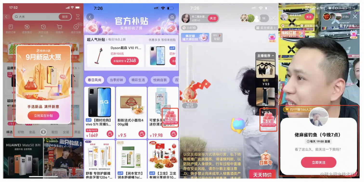 在电商的各种大促活动中,运营经常会通过各种方式来进行流量控制,比如挂件、弹窗、悬浮条等。快手电商早期营销基建比较薄弱,为了快速满足需求,通常以Native为主,部分RN、H5为辅。