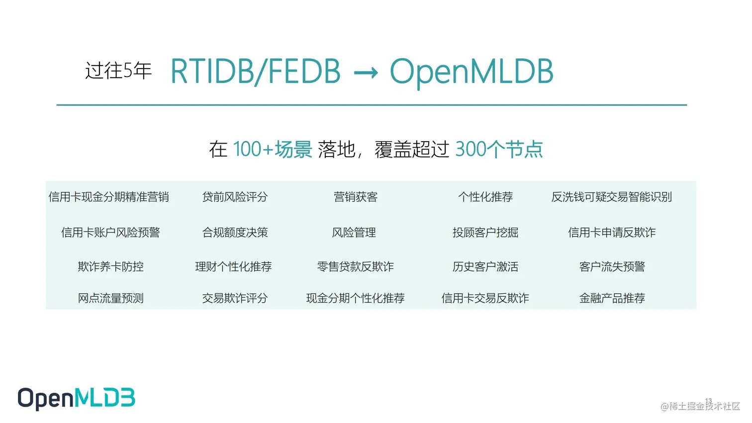 OpenMLDB 是去年6月开源的,但是其中的技术累积已经超过了四五年的时间。在第四范式的商业产品中,OpenMLDB 的前身是嵌入在 MLOps 产品中的特征平台,过去我们叫它 RTIDB 或 FEDB,已经跟随第四范式的商业化产品在100多个场景得到应用落地。