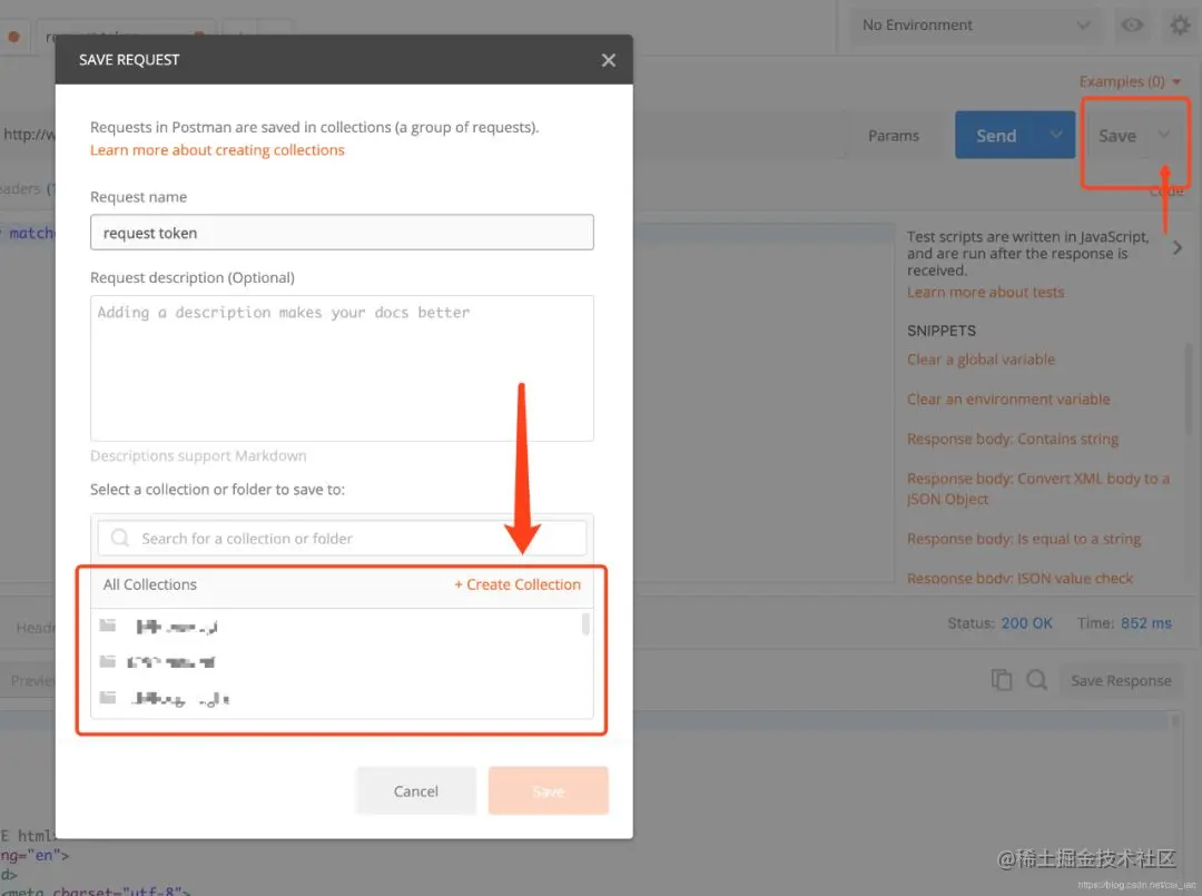 而 Postman 还为我们提供了一些常用的代码模板,在 Tests 面板右边的 SNIPPETS 功能区中,所以对 JavaScript 不大了解问题也不大。代码编写相关将在下文进行具体介绍。