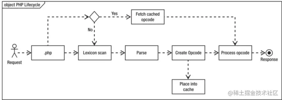 request请求(nginx,apache,cli等)-->Zend引擎读取.php文件-->扫描其词典和表达式 -->解析文件-->创建要执行的计算机代码(称为Opcode)-->最后执行Opcode--> response 返回 每一次请求PHP脚本都会执行一遍以上步骤,如果PHP源代码没有变化,那么Opcode也不会变化,显然没有必要每次都重新生成Opcode,结合在Web中无所不在的缓存机制,我们可以把Opcode缓存下来,以后直接访问缓存的Opcode岂不是更快。