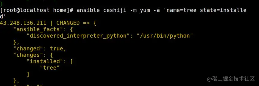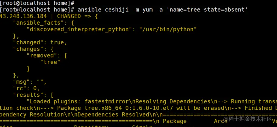 ansible ceshiji -m yum -a 'name=tree state=absent'