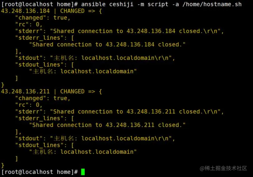 command 和 shell 模块都依赖 Python 解析器,而 raw、script 这两个模块不依赖 Python,直接调用目标客户端的/bin/sh 来执行命令。如果目标客户端安装了 Python,而且要执行的命令很简单,不涉及特殊的 shell 符号,可以考虑 command 模块,如果涉及重定向等特殊 shell 符号则要用 shell 模块;如果目标客户端没有安装 Python,就只能考虑用 raw 或者script 模块,如果临时组装 shell 命令清单,则使用 raw 模块,如果在 Ansible 控制器上已经编写好 shell脚本文件,需要发送到客户端去执行,则应该使用 script 模块。