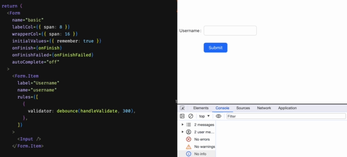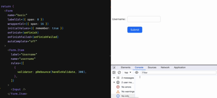 那么就需要在onChange的时机进行校验,这种情况下,如果不考虑防抖,会造成频繁的请求(注意右下角的控制台输出):