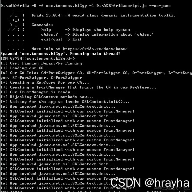 frida -U -f com.tencent.k12gy -l D:\ADB\fridascript.js --no-paus