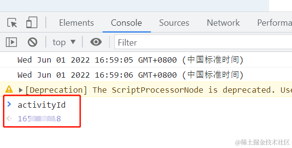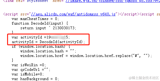 这里面看到activityId经过了一层DecodeId处理,不过没关系,直接打开chrome的开发者工具,console里输入activityId即可看到真正的值了
