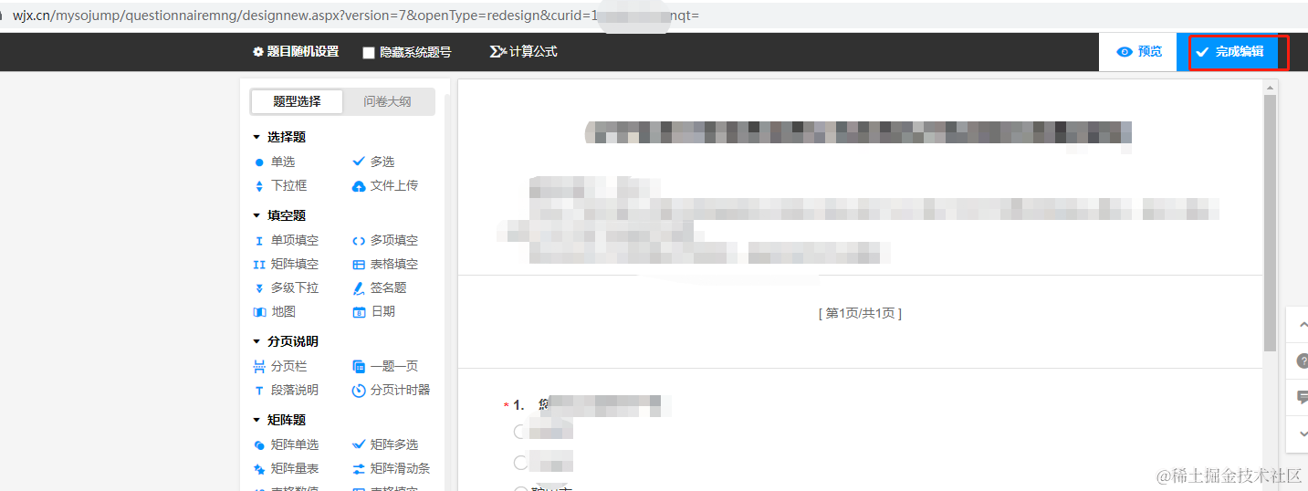 然后便进入到了问卷编辑中,此时我们点击"完成编辑"