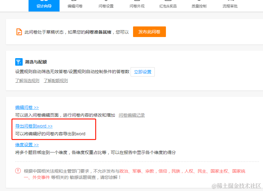 选择"导出问卷到word"功能即可使用官方提供的功能实现将问卷保存为word格式,优点是保留了格式