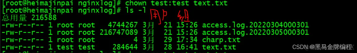 chown 用户名 文件名 --> 把其它用户创建的文件名转让给其他用户chown 用户名:组名 文件名 --> 把文件名的用户改为“其他用户名”,群组改为“其他组名”