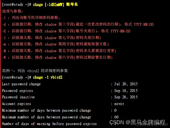 除了使用 passwd -S 之外,还有更详细的密码参数显示功能,那就是 chage 了!他的用