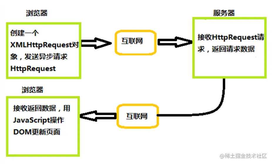 Ajax请求数据流程与“领导想找小李汇报一下工作”类似,上述秘书就相当于XMLHttpRequest对象,领导相当于浏览器,响应数据相当于小李