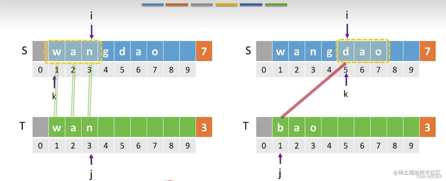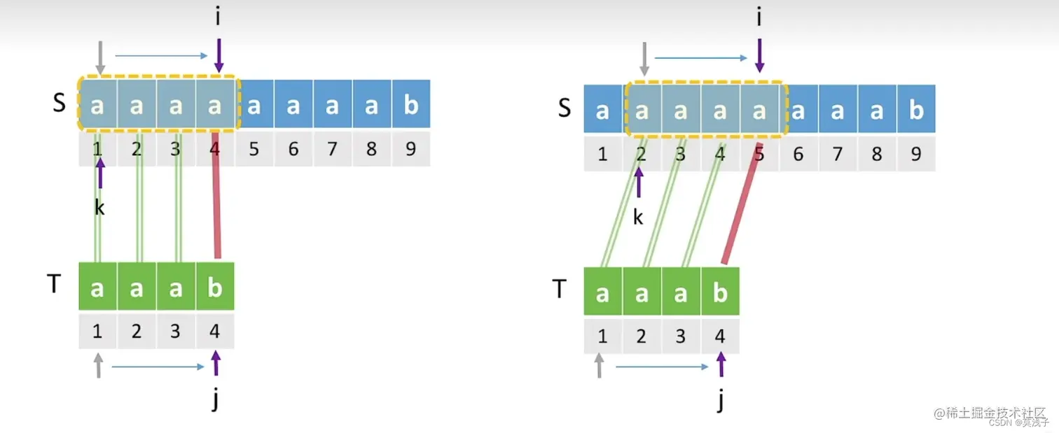 如果 j = 2的时候与 i = 4的时候不匹配,那么我们让 j = 1,i = 4。