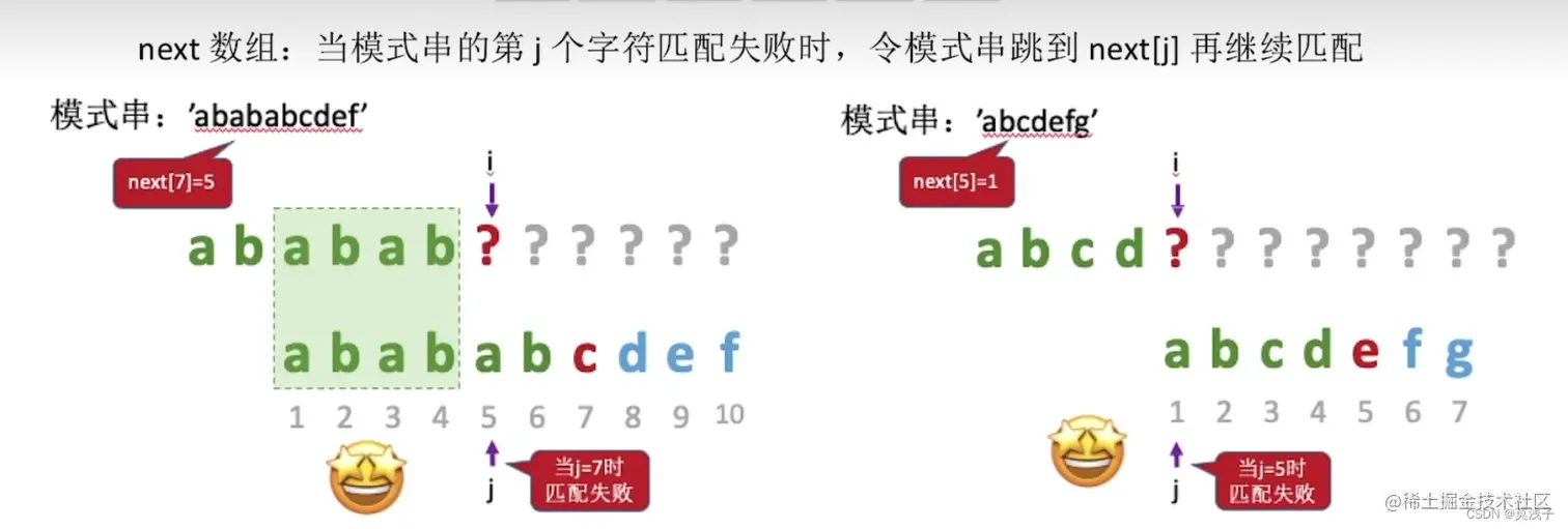 j 为5的时候ababa ,当前缀为ab,后缀为ab的时候为最长相等子串,next [5] = 3 ( 2+ 1)