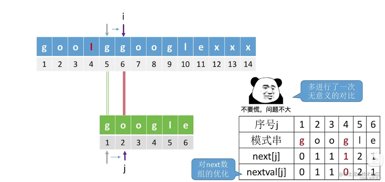 根据上面我们发现有这个情况,就是我们知道 i 指向 4 的位置 不等于g,但是我们仍有 next [ 4 ] = 1 ,继续比较了g,有点重复,所以我们可以作出优化,让next[ 4 ] = 0,j = 0 。 这样 j++,i++,让 j = 1 , 与 i = 5 进行比较了。