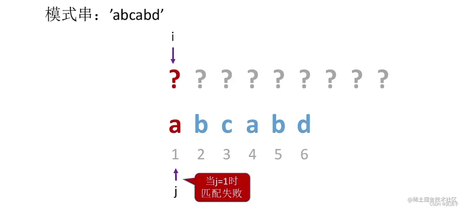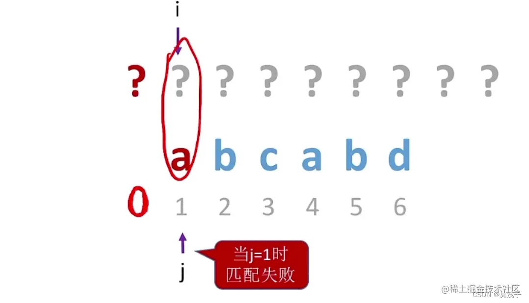 当 j = 1,就匹配失败的时候 我们可以让 j 设置为 0,然后 j 与 i 同时 ++