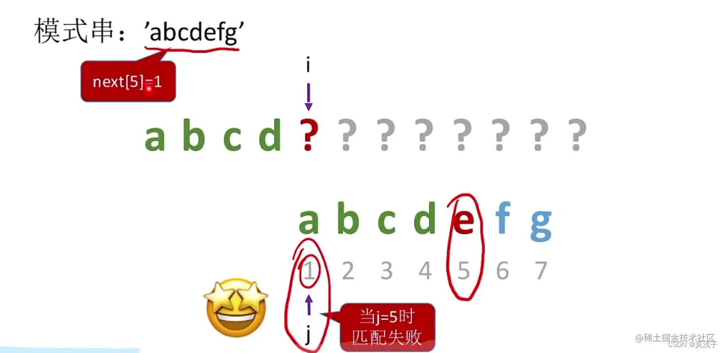 同样的也可以匹配到,我们让next [5] = 4 。虽然继续往后移主串与模式串仍能匹配,我们应该选择匹配长度最大的